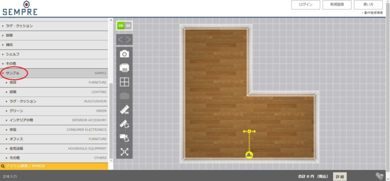 SEMPREは家具・インテリア・雑貨の販売を行っており、シミュレーターの中でも自社で取り扱っている製品を配置できるようにしてます。それ以外にも、sampleとして様々な種類の家具があり、手持ちの家具に似た形の物を選んで、大きさを設定して自由に配置することができます。