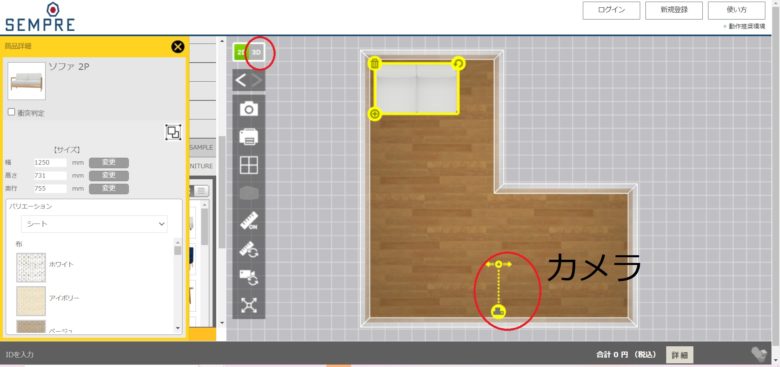 家具の配置が終わったら、カメラの位置と方向を調整してから、「3D」をクリックすると実際に配置した3Dイメージを見ることができます。