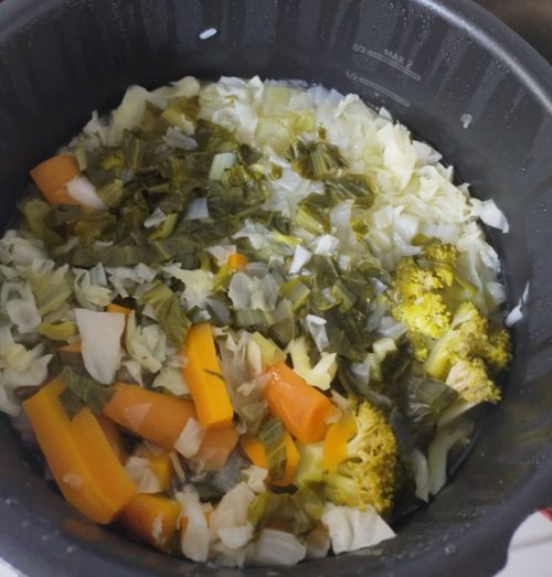 1.野菜を用途に合わせて切り、圧力鍋へ。野菜の嵩より水位が2cm程度少ないくらいの水を入れる。