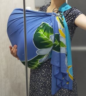私が使ったのは最初に使ったのは、手作りのリングタイプのスリングでした。夏生まれの男の子ということで、手持ちの青いロングパレオで作ってみたのです。