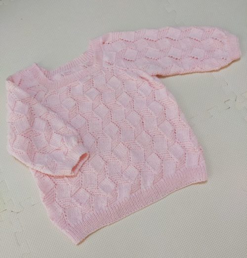 爽やかなブルベのピンクで、直線的な幾何学模様が並んで、大人かわいいセーターに仕上がりました。