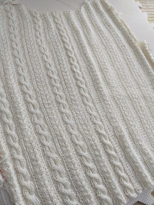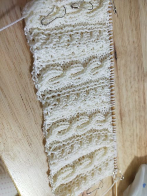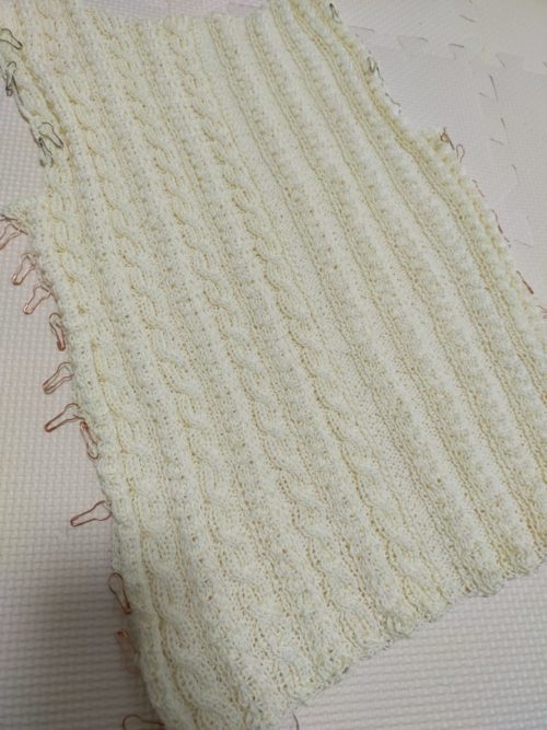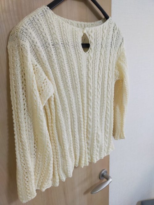 後ろ身頃のもう一方の模様は縄編みが入ります。糸に伸縮性があまりないので、きつくなりすぎないように気をつけながら編みました。