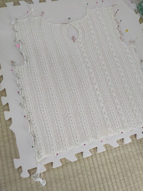 パーツを編み終わったら、後ろ身頃の左右をとじてから、パーツごとにスチームアイロンしました。ピン沢山使いました!