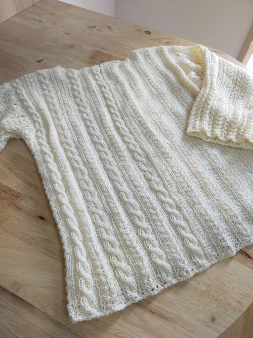 細糸で模様編みなので時間が、かかりましたが、ついに完成です!まだ試着をしていないので、前後の脇下の段数の違いがどう響くか少し不安はありますが、とても可愛く仕上がって大満足です。