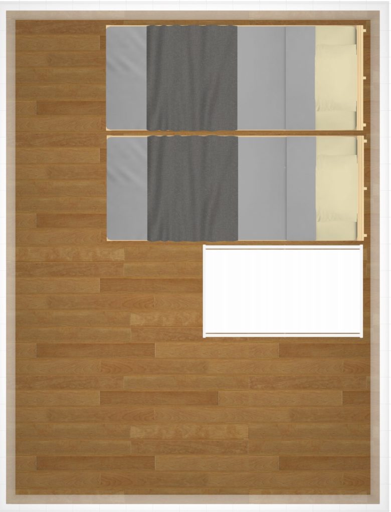 もっとも一般的な80cm幅で、セミシングルサイズの寝具を6畳の寝室に2つ置くことをイメージしてみます。