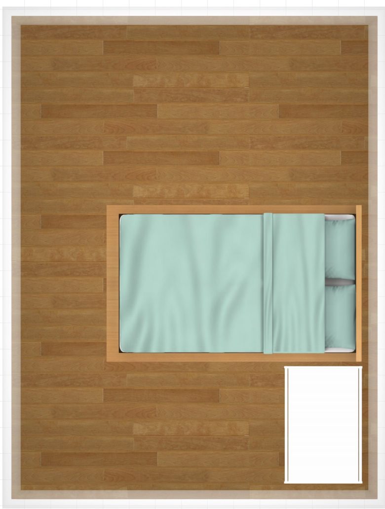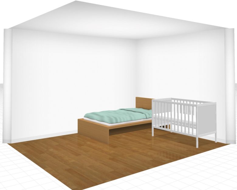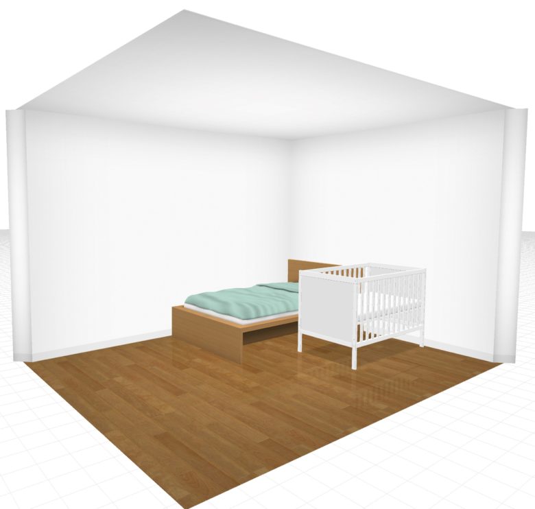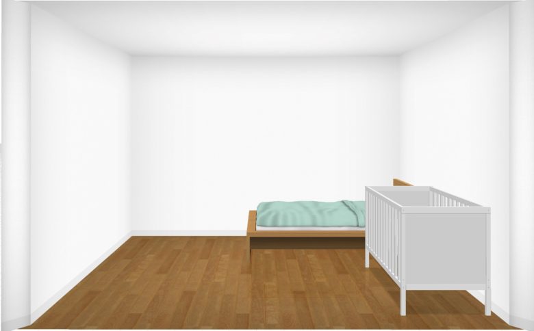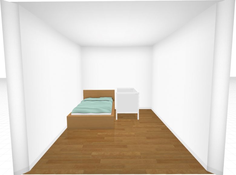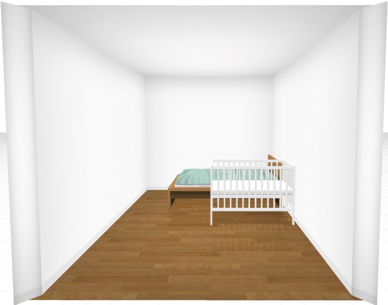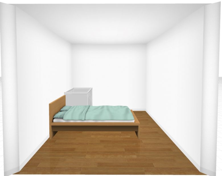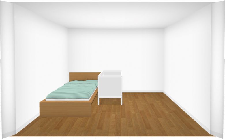 ただ、標準サイズのベビーベッドを置くことを検討している場合、マットレスの大きさのみで部屋の横幅にほとんどゆとりがないので注意が必要です。フレームを含んだ大きさで実際に置けるかどうか確認してくださいね。