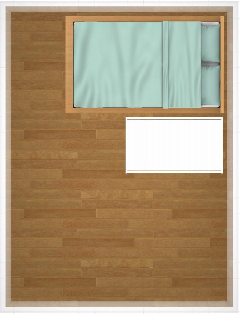 まずはお部屋の長辺に対して、セミダブルベッドもベビーベッドも同じように長辺をそろえて配置する場合のレイアウトです。