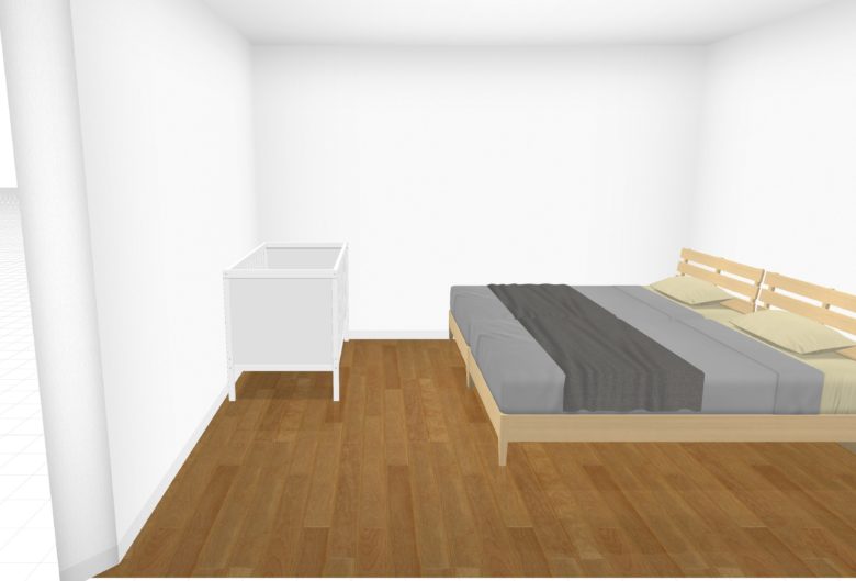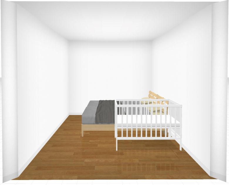 正面からの視点では奥のスペースが隠れてわかりにくいので、奥からの視点を中心に標準サイズのベビーベッドを置いた場合の3Dイメージを確認してみます。