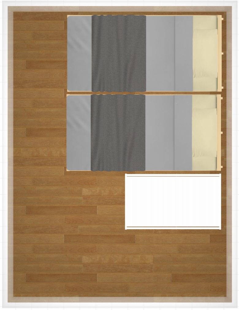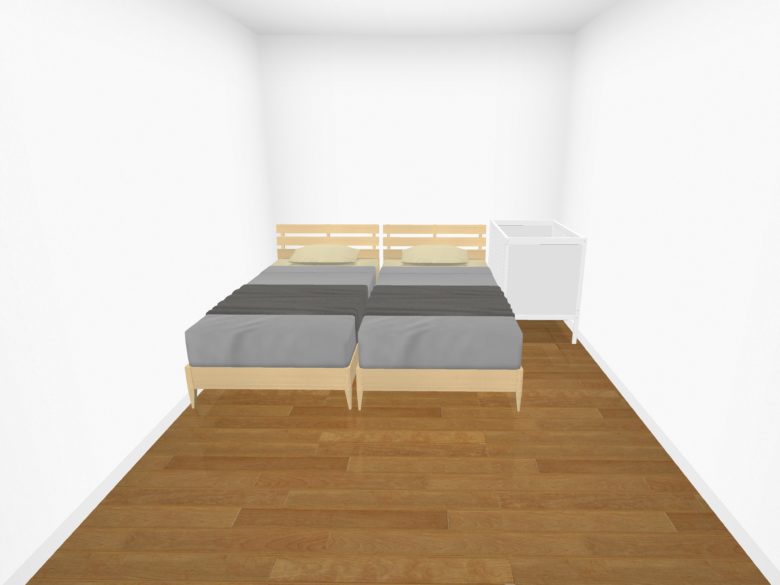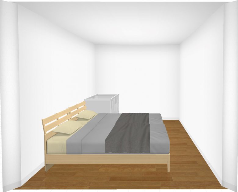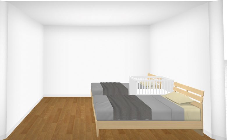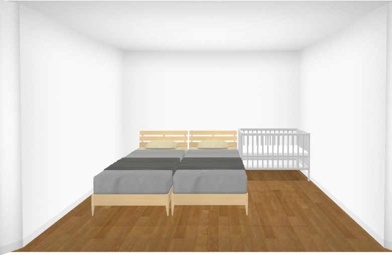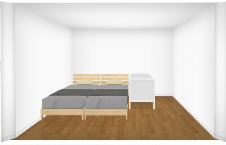 それでは最後に、奥のベッドへの出入りが楽になるよう、奥にスペースを設け、さらに赤ちゃんのお世話もしやすいようにベビーベッドを横向きにしたレイアウトです。