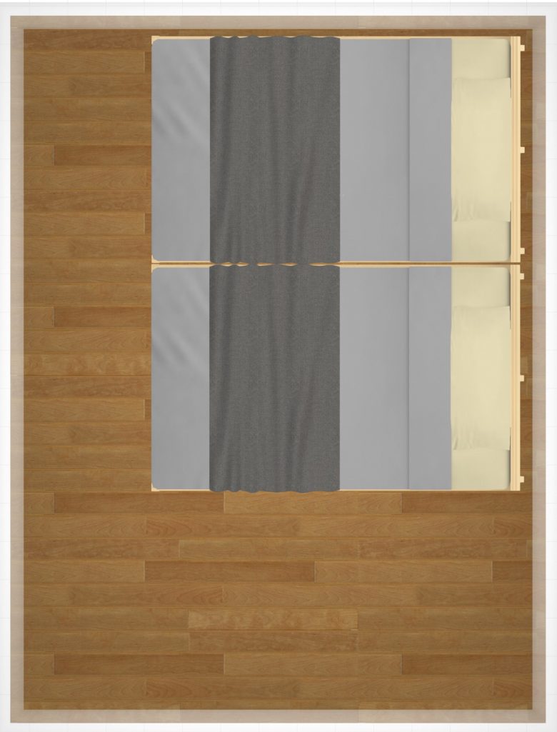 図のように片側を開け、出入りを足元に固定する場合は、壁に沿ってスリム設計の家具も置くことができると思います。